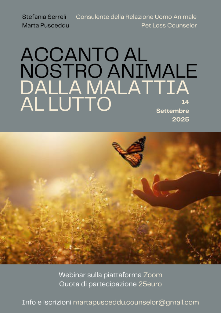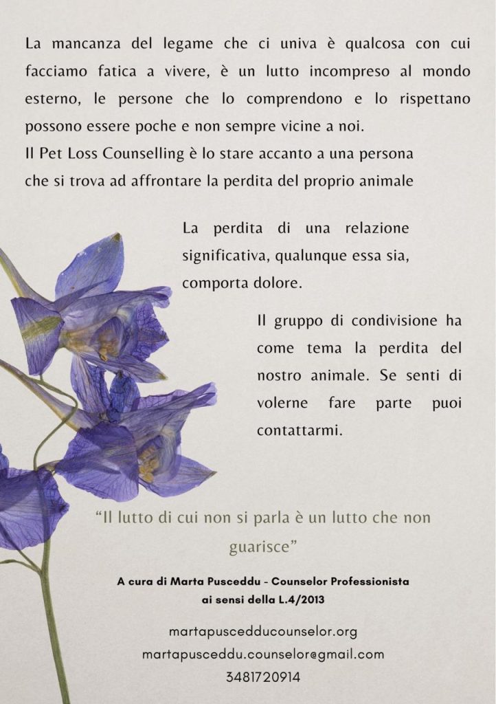Sto organizzando un gruppo di condivisione che ha come tema la Perdita del nostro Animale. Se senti di volerne fare parte puoi contattarmi.